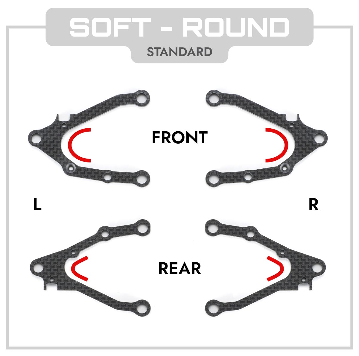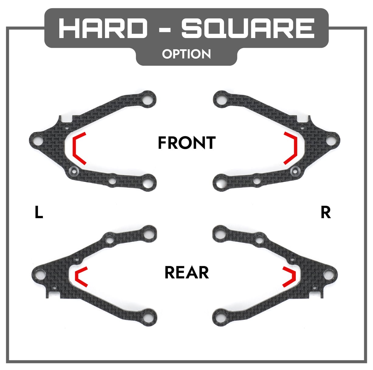 1.6mm / 2.0mmTwo versions of the lower suspension arm are available: the standard arm included in the kit, and a stiffer hard version as an optional part. Same geometry, different stiffness to match grip conditions and driving styles. Internally rounded (Soft) or squared (Hard) shape for easy identification. No setup changes, no extra complexity.