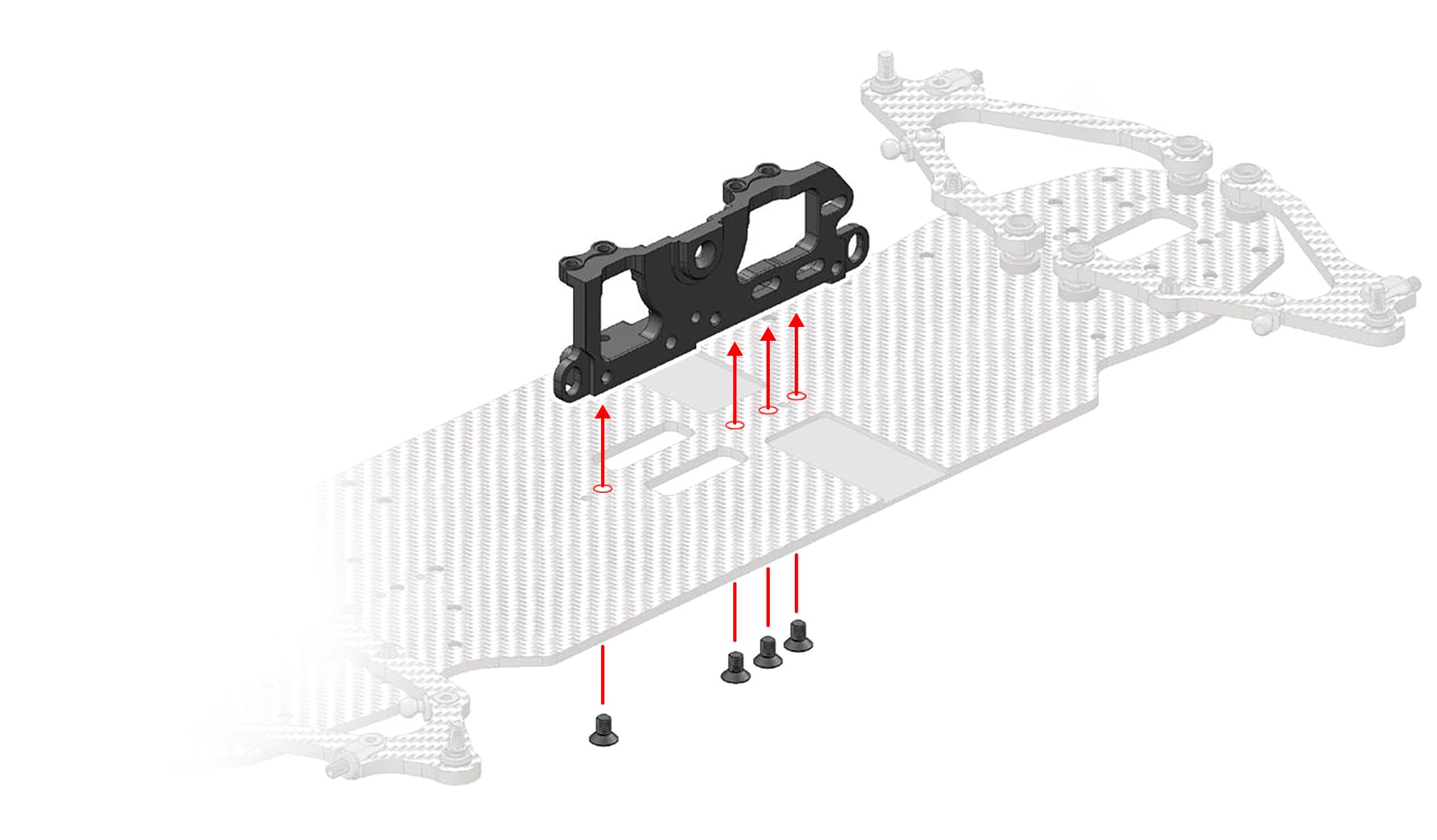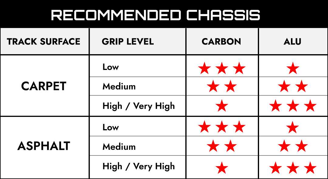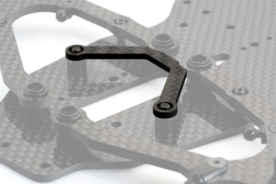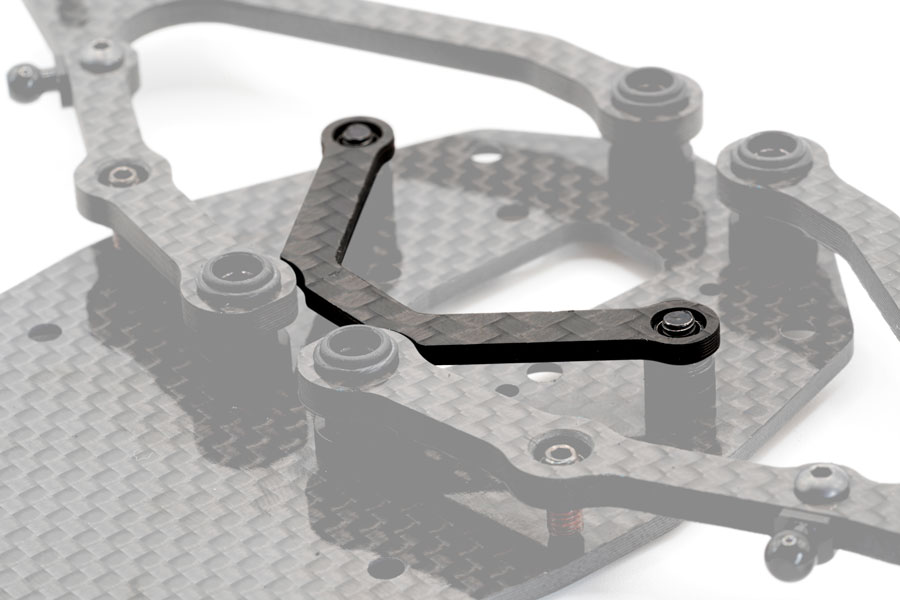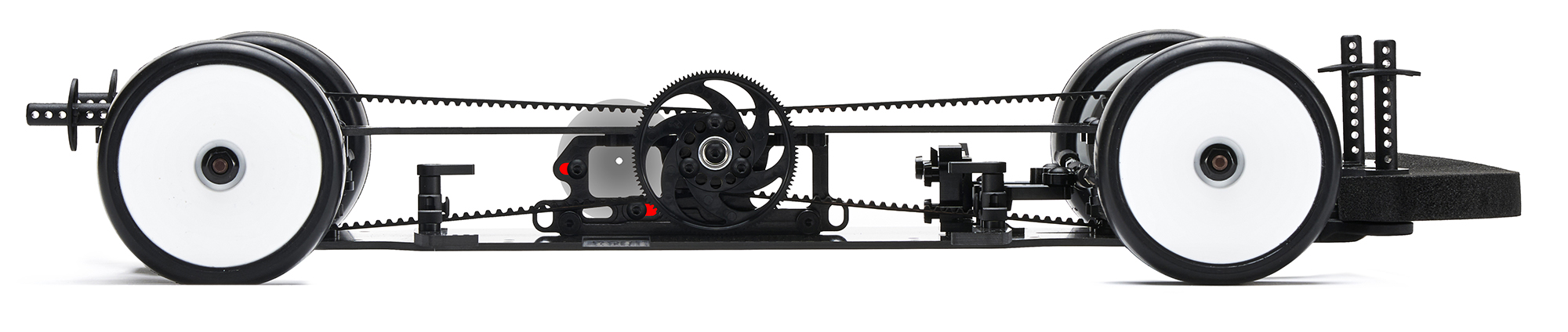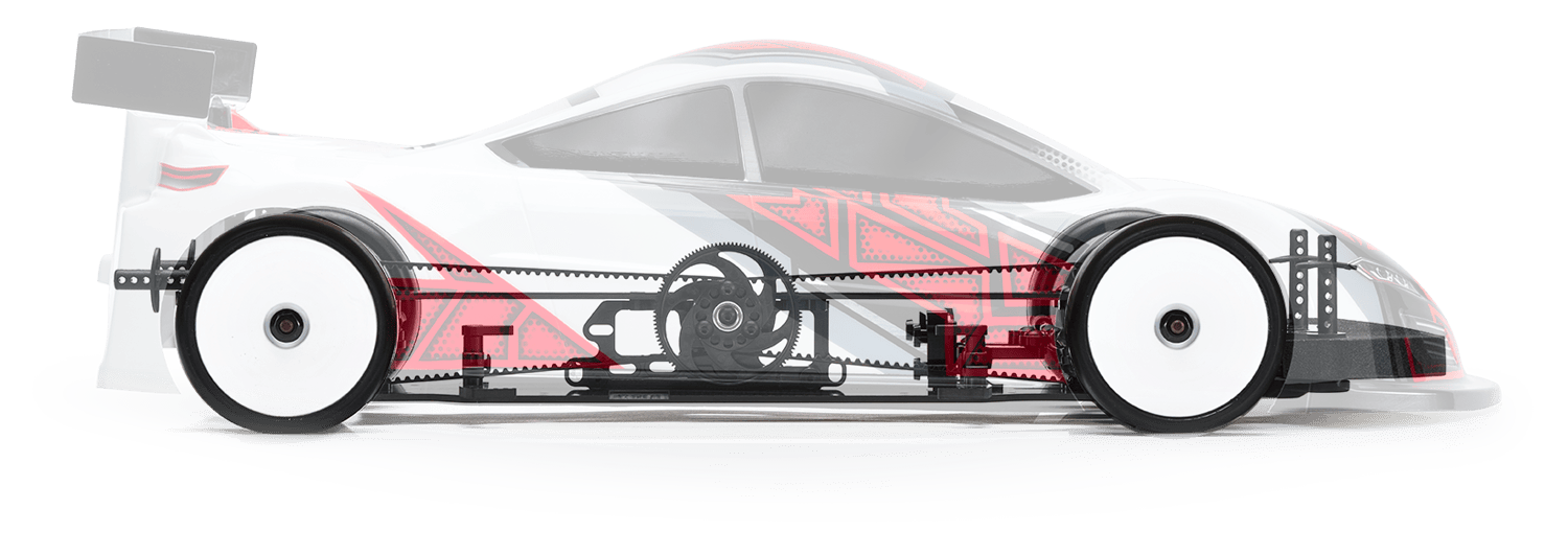 38/20T – 351mm (Final Ratio 1.9) Strong braking feel and direct throttle response Perfect for low-grip or tight, technical tracks.Standard black pulleys ensure reliable performance. For those chasing maximum drivetrain efficiency, an optional low-friction version is available in a lighter color. A small detail with a measurable impact smoother feel, reduced drag, and a distinctive look.High Performance Low-Friction PulleysDRIVETRAINCentral PulleyFollowing the same light design philosophy, the center pulley holder has been engineered with great attention to detail. It features four integrated bearings, ensuring smooth rotation and excellent dimensional stability even under high loads.Tuning OptionsMotor MountMachined from solid aluminum, the motor mount has been carefully designed to provide optimal structural rigidity while minimizing weight. A balanced approach to strength and efficiency, right where it matters most. Stiff Where It Matters, Light Where It Counts Low HighCG AdjustmentDesigned with ease of use in mind, the motor mount features a three-point interface that allows for two alternative motor positions, depending on chassis thickness or specific setup goals. A simple but smart solution whether you're looking to prevent ground contact or fine-tune the car’s center of gravity, it delivers versatility with minimal effort.Tuning OptionsWeight distributionWeight placement is key to adapting the car to different track conditions. That’s why every mounting point for optional weights has been carefully positioned to give you the best possible balance, wherever you race.Chassis rigidityAdaptability to different track conditions is ensured by the option to adjust motor mount stiffness through one, two, three, or four mounting screws. Multiple combinations are possible, each designed to fine-tune chassis response to suit the surface.Deck torsionNote: Depending on the top deck used (standard 2.0mm or thinner 1.6mm) you may need to vary the number and type of shims for optimal balance.Two specific shim types offer precise control over upper deck torsion. A 3x4x0.1mm shim between screw thread and Motor Mount increases free flex range, making the car more responsive. A 4x5x0.1mm shim under the screw head reduces flex by increasing clamping force, resulting in a stiffer assembly. A simple, effective way to fine-tune chassis feel.Each chassis stiffener is designed to extract maximum performance from your setup, depending on the surface and grip level. Chassis stiffenersFLEX CONTROLStrategically placed carbon stiffeners have been designed to increase lateral rigidity of the chassis. Positioned near the bulkheads, they help control side-to-side flex, enhancing consistency and response under all grip conditions.Brace chassisFLEX CONTROLShock