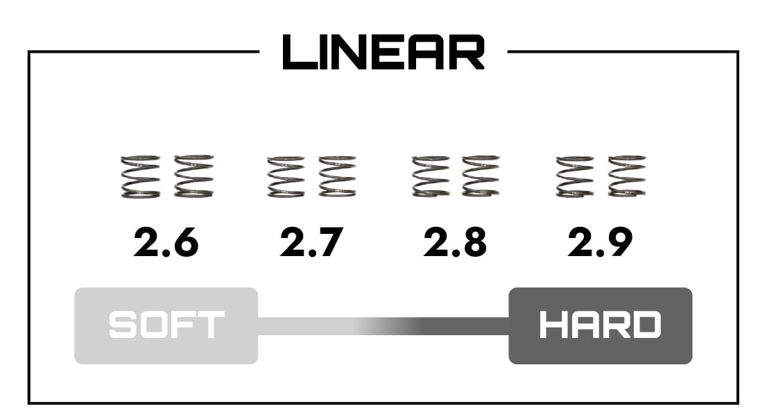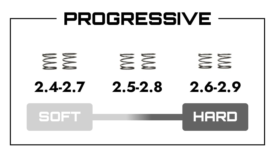 absorbersThe low center of gravity required for top-level touring car performance led us to push our USP (Ultra Short Profile)concept even further. By minimizing the size of molded parts, we’ve created an extremely compact shock design without compromising function or tuning range.Tuning OptionsShock SpringTwo types of shock springs are available to match different track demands: progressive or linear, your choice. Progressive springs offer broad adaptability across a wide range of conditions, while linear springs are ideal for precise setup refinement in more specific grip windows. Used in combination front and rear, they unlock a wide spectrum of tuning possibilities.Tuning OptionsStabilizer