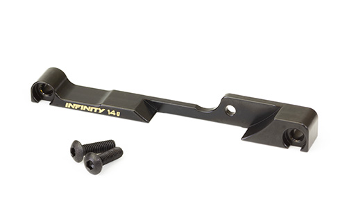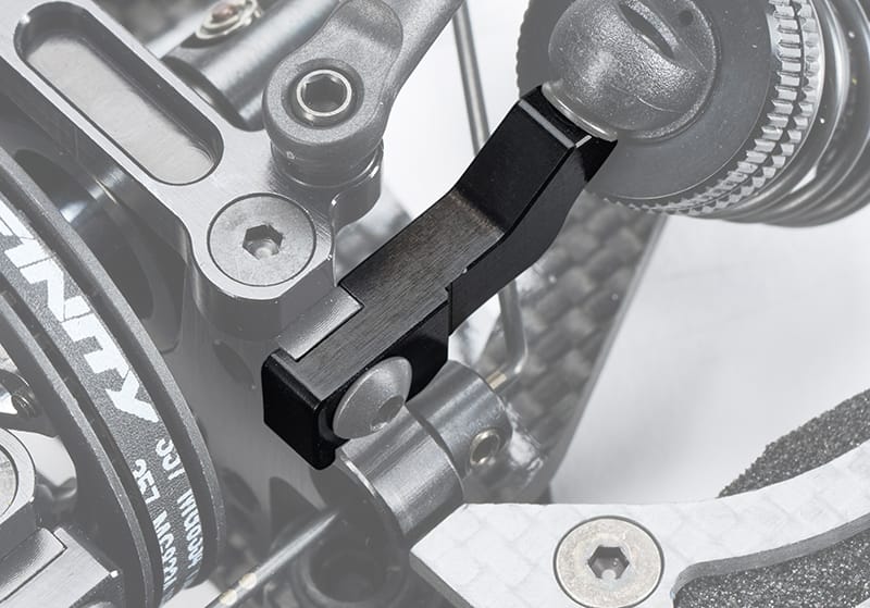A single central screw ensures secure mounting without compromising rigidity. Fewer parts mean reduced weight, faster maintenance, and improved overall usability.Shock towerAvailable as standard in 2.2 mm Carbon and, for high‑grip layouts, in 2.0 mm 7075‑T6 Alu, the IF14 Spec1ale chassis is precision‑machined with targeted stiffening zones. Carbon offers consistent torsional control and razor‑sharp feel across conditions, while Aluminium adds extra stability without sacrificing essential flex.ChassisTuning OptionsCarbon